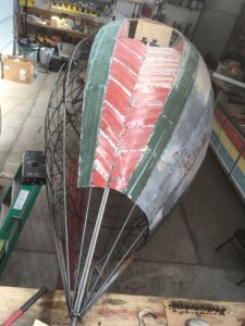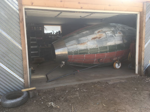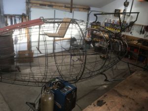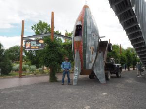 An open-cockpit rocket metal sculpture entitled “Niner Echo Xray” was built by RTDavis from new and recycled metals. The entire body of the sculpture fit in the artist’s workshop on his farm in NM. (One fin had to be cut off to move it out through the shop door, then welded back on.)