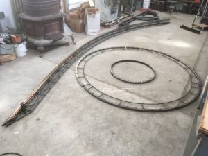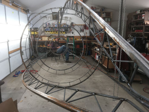 This sculpture is 22 feet tall and 7 feet in diameter and weighs about 800 pounds. The shop is built with an I-beam running the long way in the room and ten feet off the floor. Along this tracks a chain fall which can lift a ton or so, allowing the artist to single-handedly move the sculpture around.