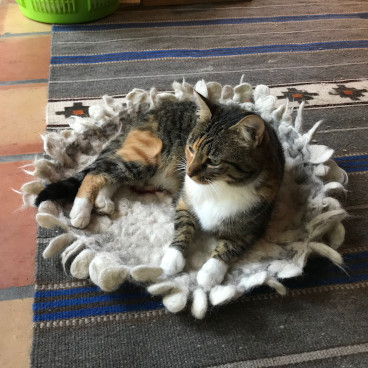 Clarity has an enterprise to use our sheep’s wool: felted cat beds. This year, CamaGatos will be for sale at one show only: Taos Wools Festival, October 4-5, 2025, in Taos, NM.