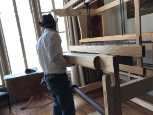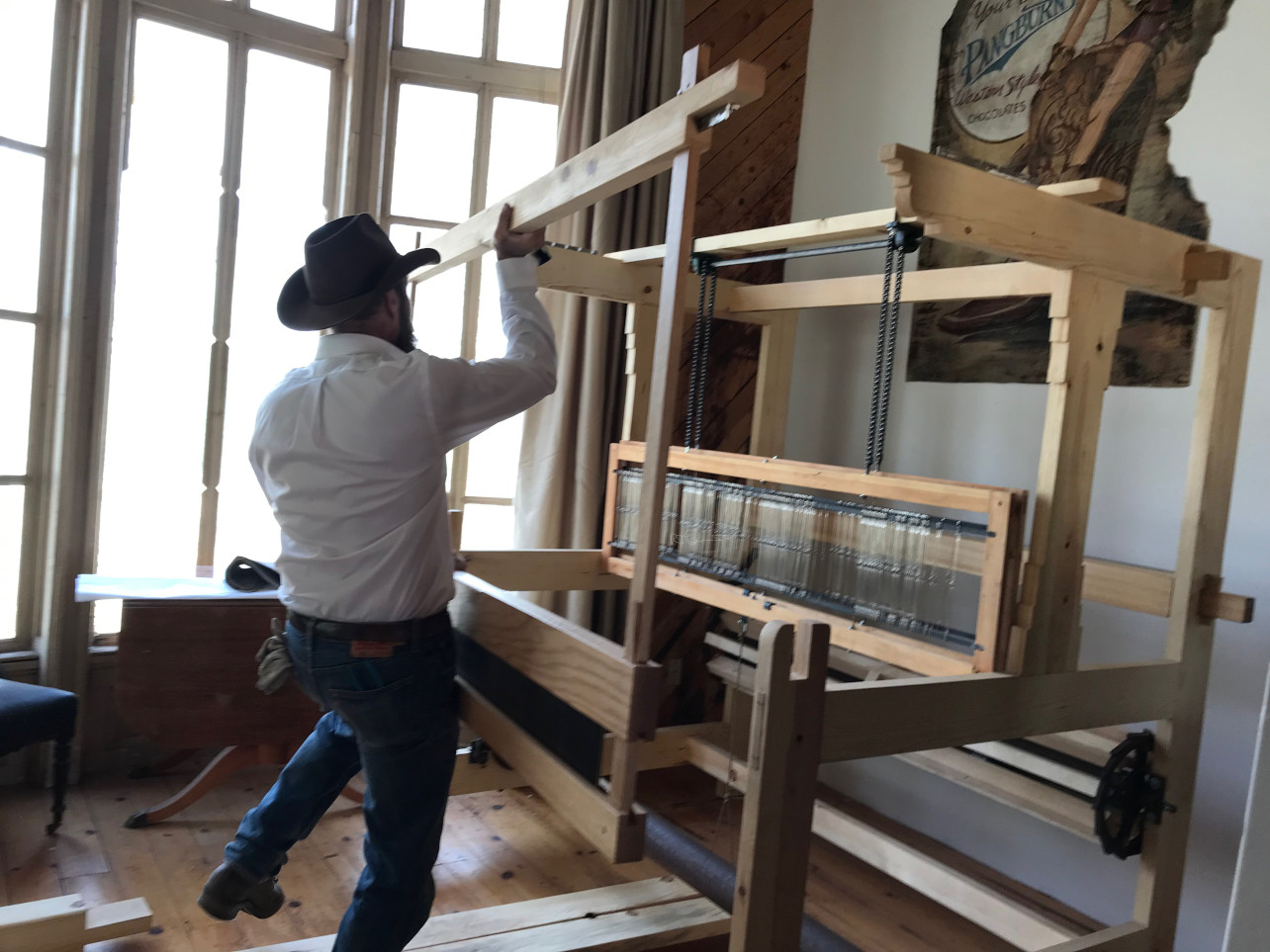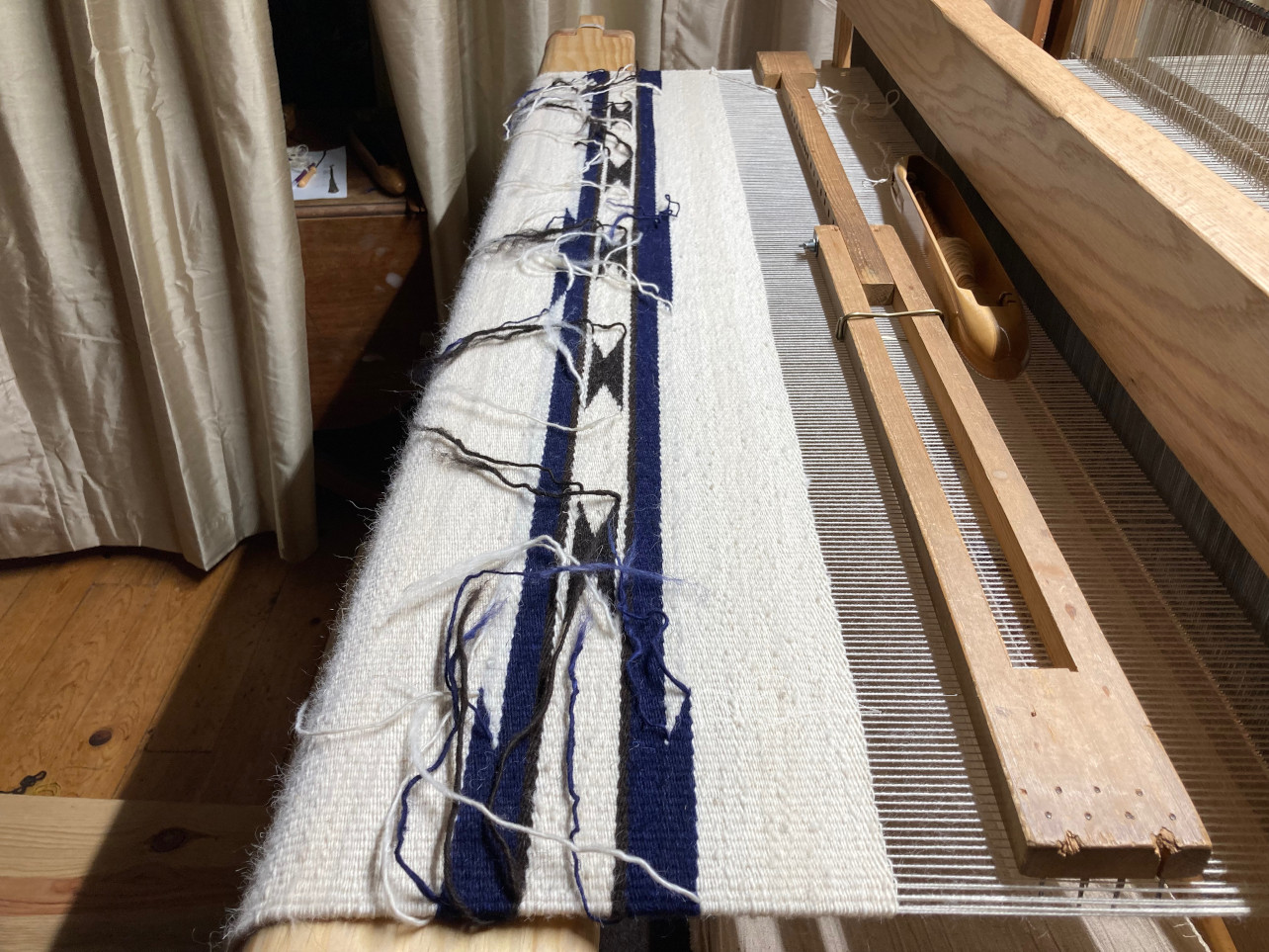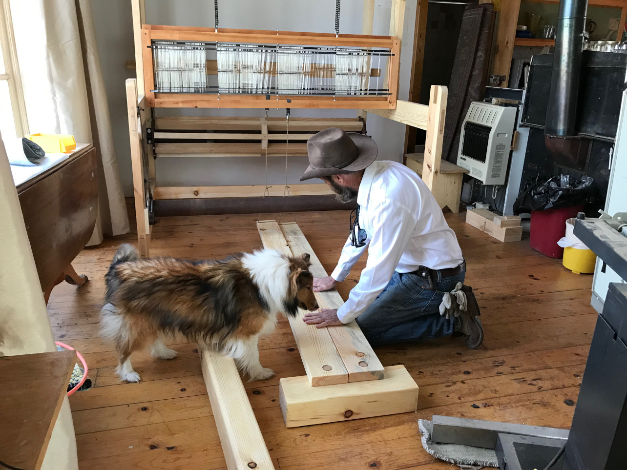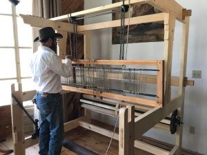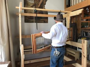 The tradition of Rio Grande weaving has its own type of loom, the walking loom, so called because the weaver stands on the pedals that work the shed. As the weaver operates the loom, he/she looks as if they might be walking. (I think it looks more like sauntering, but we don’t call it the Rio Grande Sauntering Loom.) Years ago, I was given an old, quite authentic walking loom from Chimayo, a nearby community here in the Espanola Valley. This loom had big problems that I never solved, so I decided to use its very cool cast iron ratchets, pivots and dogs to create my own brand new walking loom. I got some local Ponderosa Pine lumber milled for the project from my friend Billy Moore who owns and operates a sawmill in the nearby community of Hernandes. (That photo Ansel Adams took, Moonrise Over Hernandes? He shot that across the highway from Billy’s mill.) I then went for a visit to my old friends, Irvin and Lisa Trujillo, who are well known weavers working in the Rio Grande tradition, to see and measure a couple of looms that were made decades ago by Irvin’s father, Jacob. (My siblings and I grew up sleeping under blankets that my mother commissioned Jacob Trujillo to make.) All of the old walking looms that I have seen in use are made from sawmill cut dimension lumber, two by sixes, four by fours, etc. My loom gives the nod to this even though I shaped and sized the lumber myself. Looms take a lot of force and continual beating from, well, the beater beating in the weft, so they need to be strong in a way that they do not wiggle apart and fall in pieces around the weaver. This new loom is made with full mortise and tenon construction just like all the good, old Rio Grande looms I’ve seen. I can weave sixty inch wide pieces on this monster.