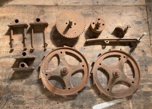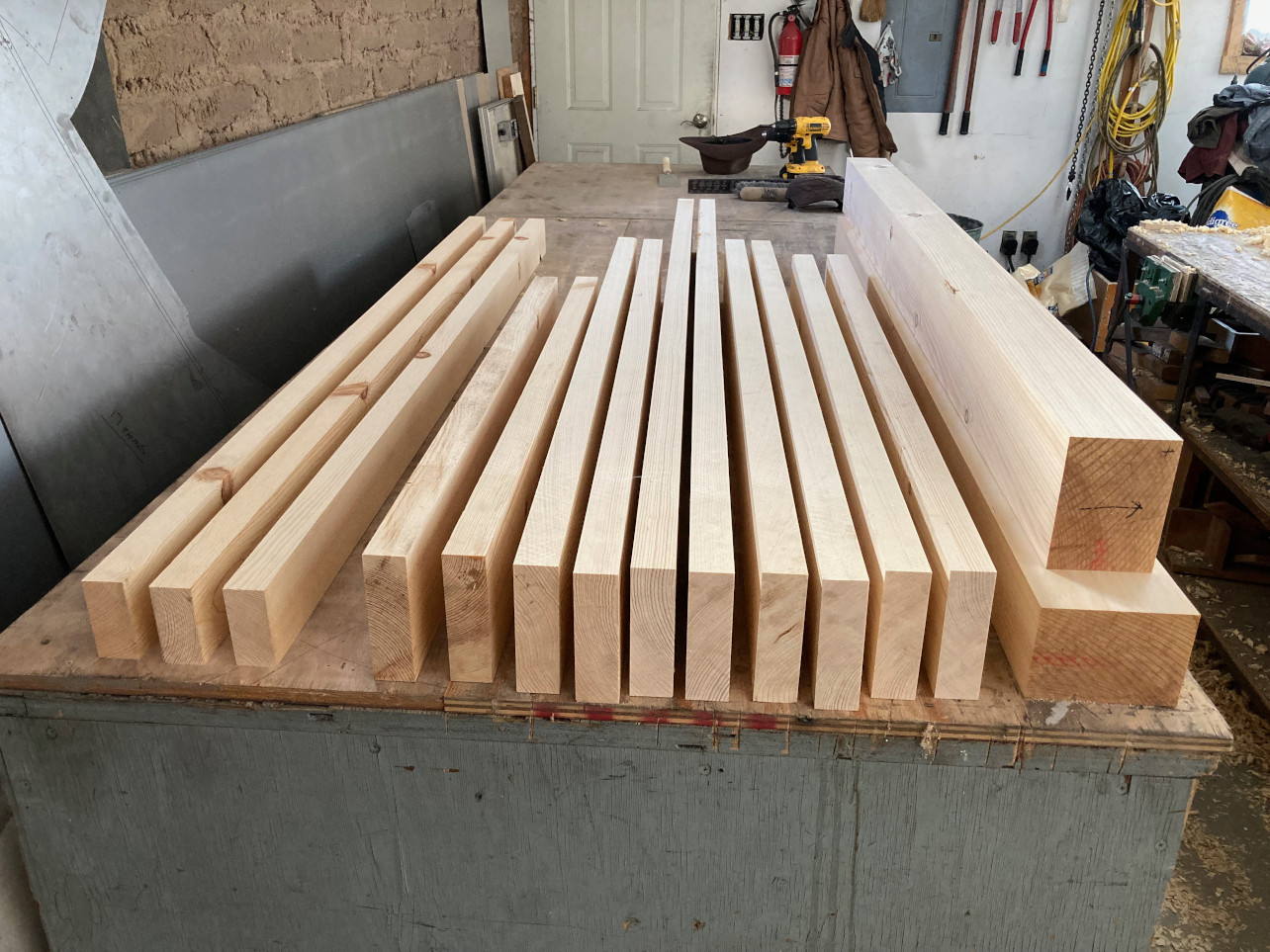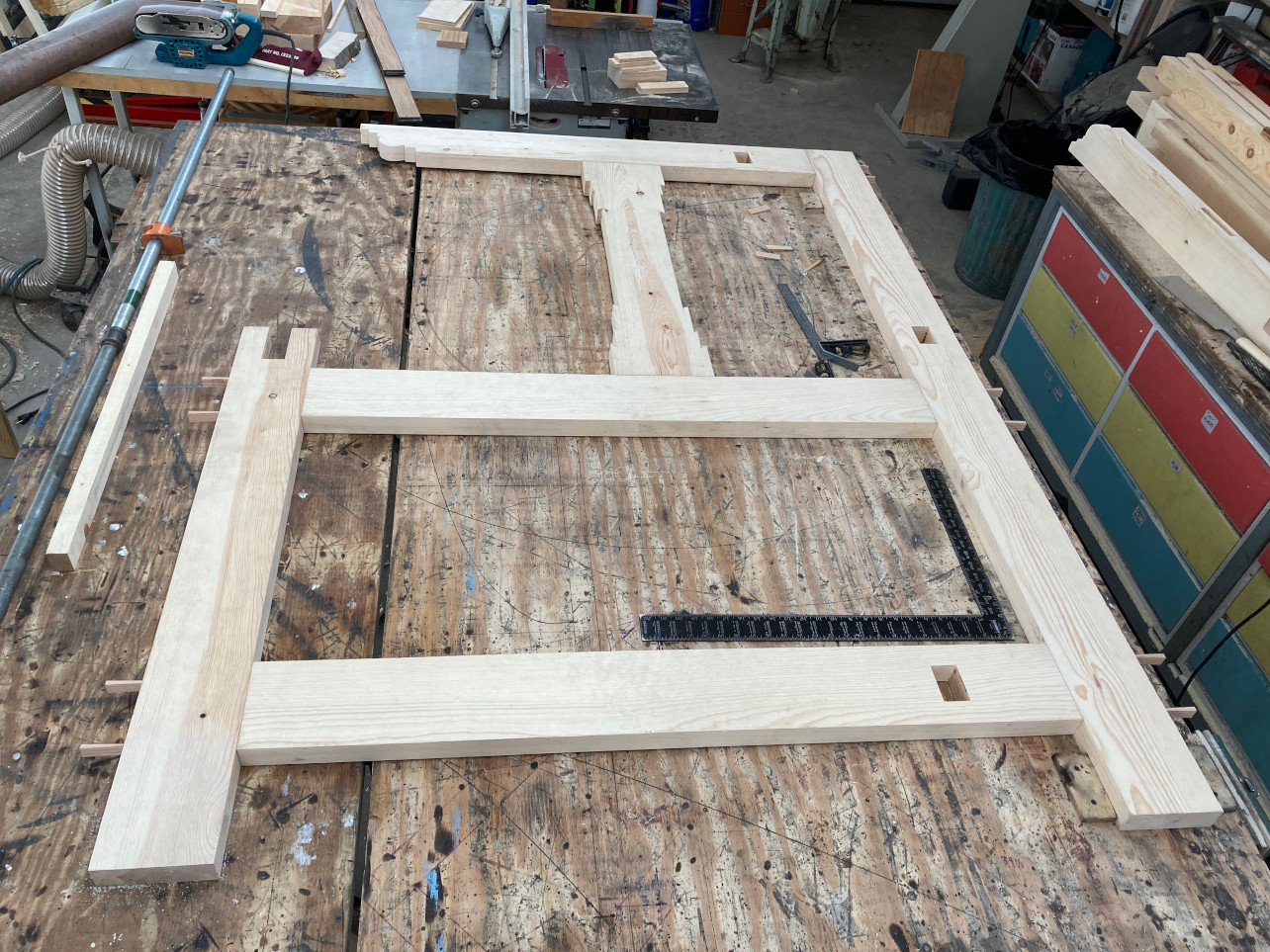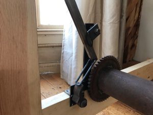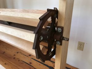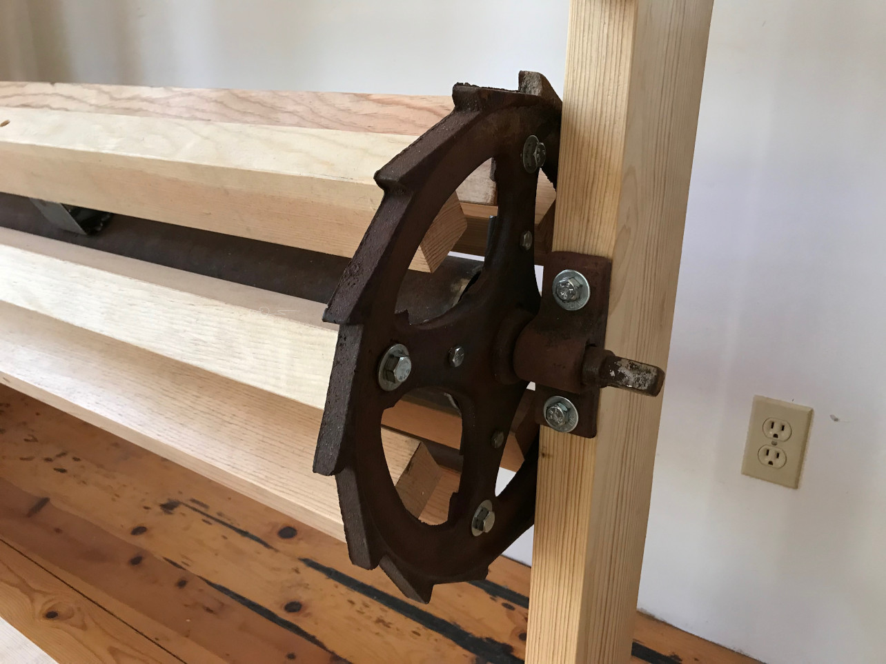 The tradition of Rio Grande weaving has its own type of loom, the walking loom, so called because the weaver stands on the pedals that work the shed. As the weaver operates the loom, he/she looks as if they might be walking. (I think it looks more like sauntering, but we don’t call it the Rio Grande Sauntering Loom.) Years ago, I was given an old, quite authentic walking loom from Chimayo, a nearby community here in the Espanola Valley. This loom had big problems that I never solved, so I decided to use its very cool cast iron ratchets, pivots and dogs to create my own brand new walking loom. I got some local Ponderosa Pine lumber milled for the project from my friend Billy Moore who owns and operates a sawmill in the nearby community of Hernandes. (That photo Ansel Adams took, Moonrise Over Hernandes? He shot that across the highway from Billy’s mill.) I then went for a visit to my old friends, Irvin and Lisa Trujillo, who are well known weavers working in the Rio Grande tradition, to see and measure a couple of looms that were made decades ago by Irvin’s father, Jacob. (My siblings and I grew up sleeping under blankets that my mother commissioned Jacob Trujillo to make.) All of the old walking looms that I have seen in use are made from sawmill cut dimension lumber, two by sixes, four by fours, etc. My loom gives the nod to this even though I shaped and sized the lumber myself. Looms take a lot of force and continual beating from, well, the beater beating in the weft, so they need to be strong in a way that they do not wiggle apart and fall in pieces around the weaver. This new loom is made with full mortise and tenon construction just like all the good, old Rio Grande looms I’ve seen. I can weave sixty inch wide pieces on this monster.